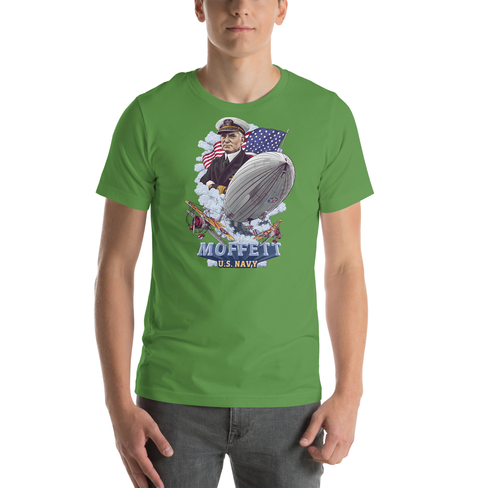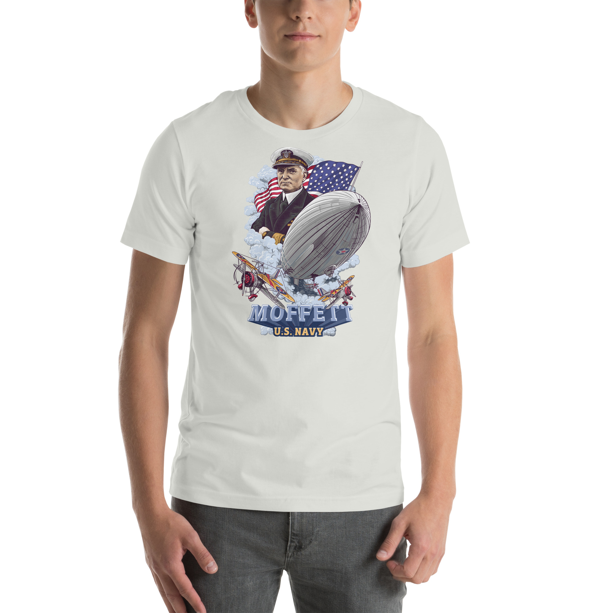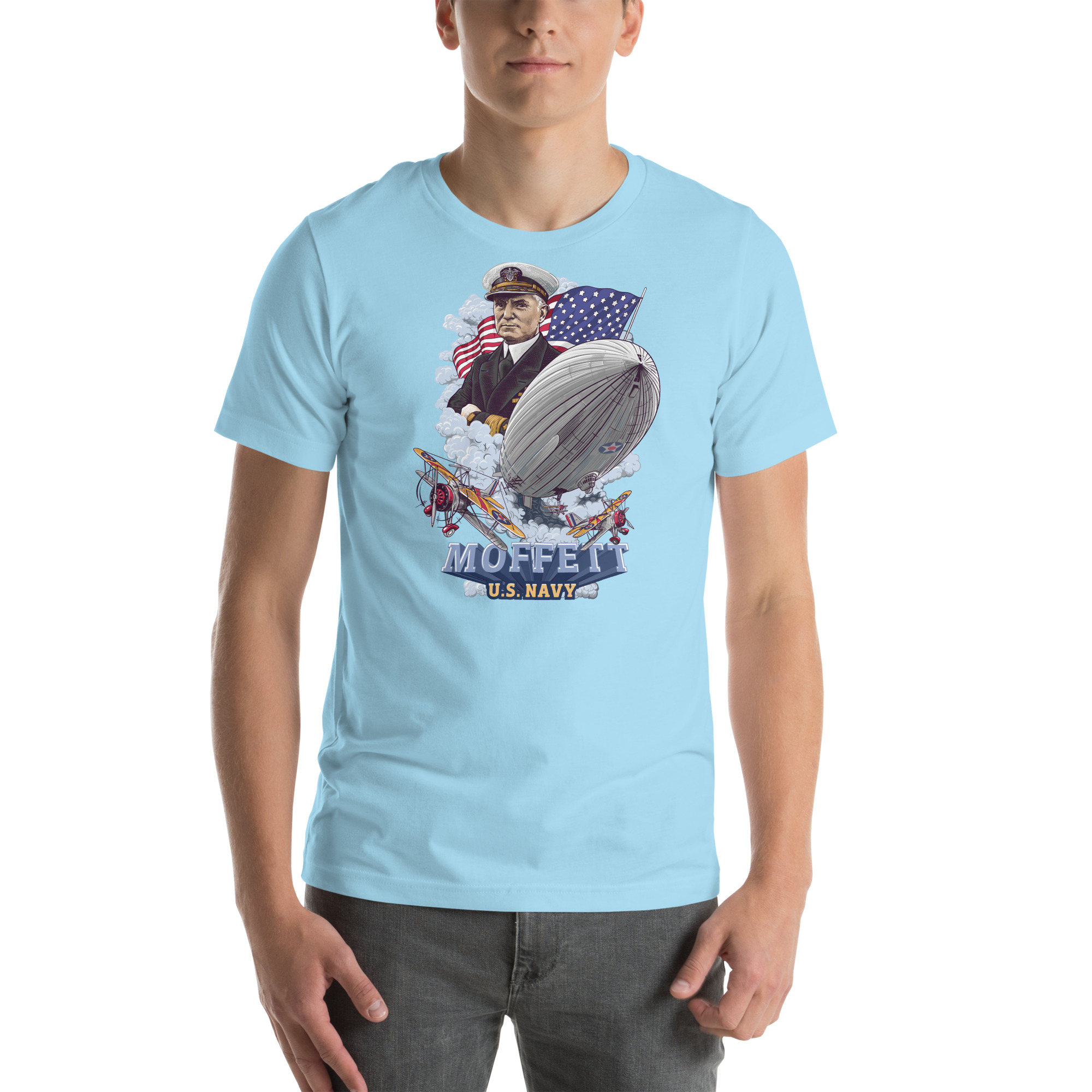This light version Moffett Macon Akron T-shirt honors Admiral William A. Moffett, a leader in U.S. naval aviation. The design shows Moffett above the USS Akron as it floats through the clouds. A large American flag waves in the background, while Sparrowhawk biplanes take off from the airship, with one flying close.